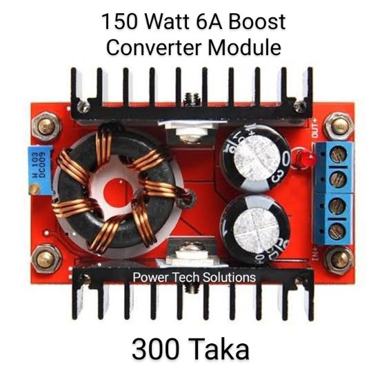 ১৫০ ওয়াট ৬ এম্পিয়ারের বুস্ট কনভার্টার মডিউল। এই মডিউলের সাহায্যে ৬ এম্পিয়ার পর্যন্ত লোড নেয়া যাবে। ইনপুট ভোল্টেজ : ১০ ভোল্ট থেকে ৩০ ভোল্ট আউটপুট ভোল্টেজ: ১২ ভোল্ট থেকে ৩৫ ভোল্ট সর্বোচ্চ কারেন্ট: ৬ এম্পিয়ার